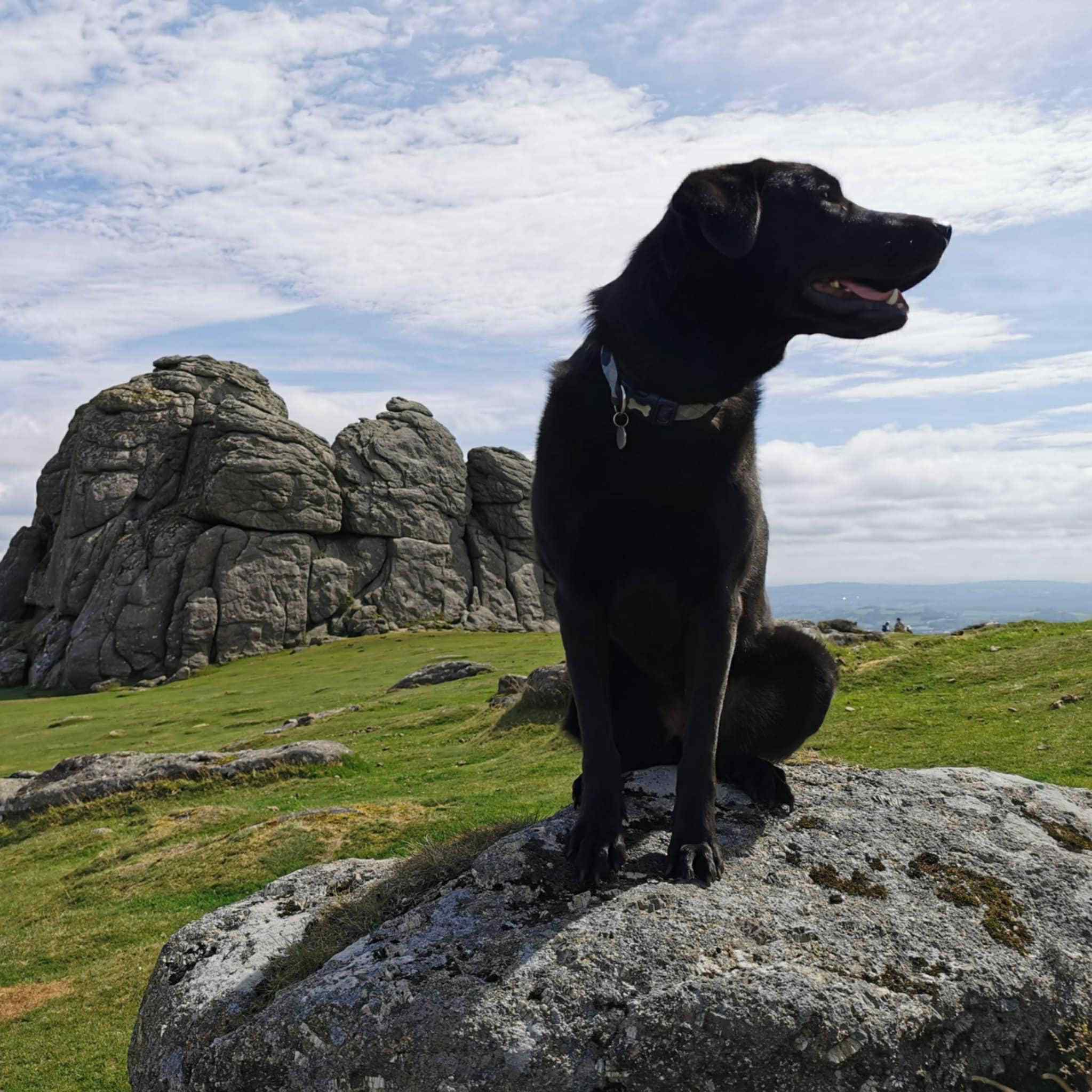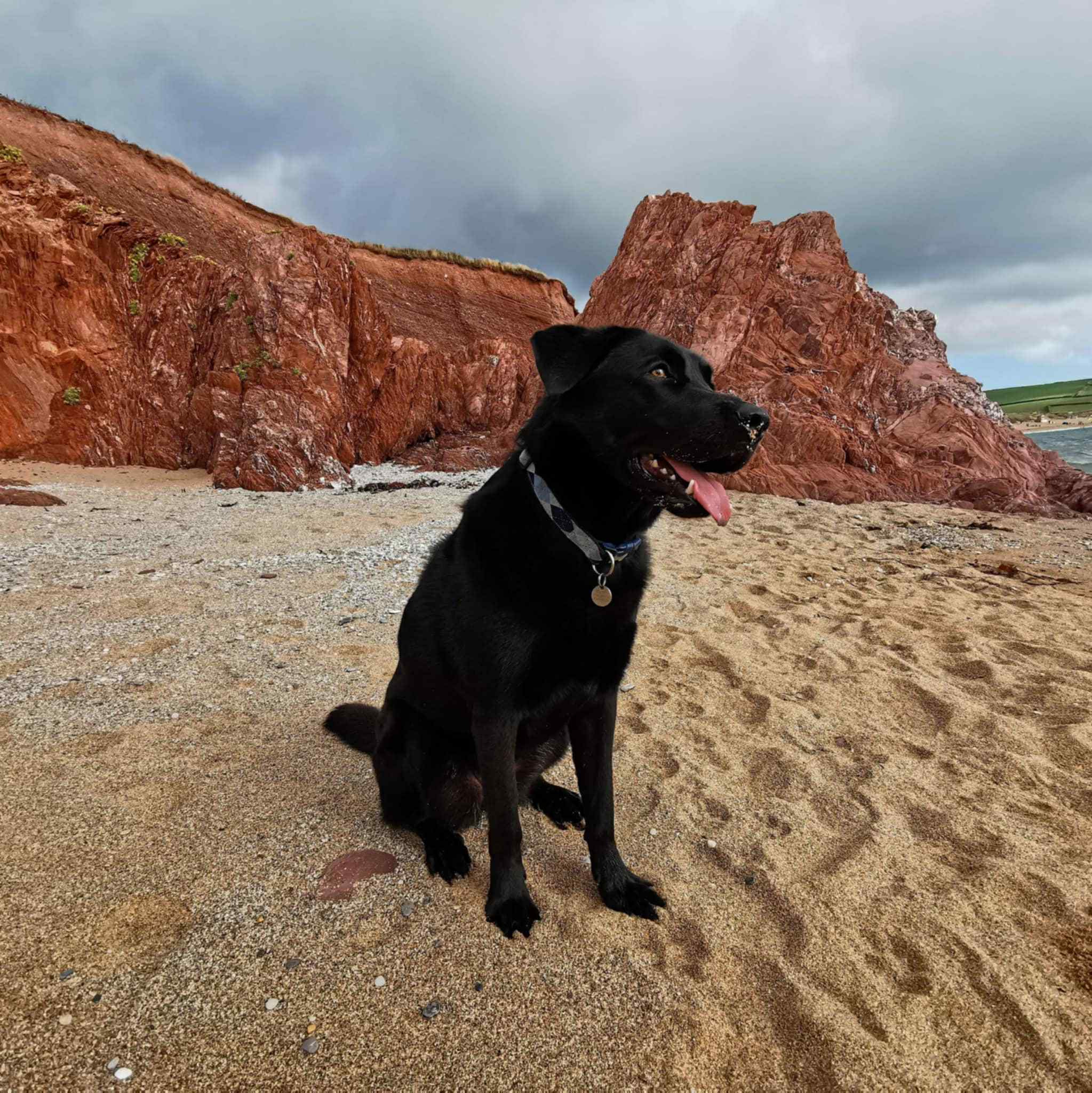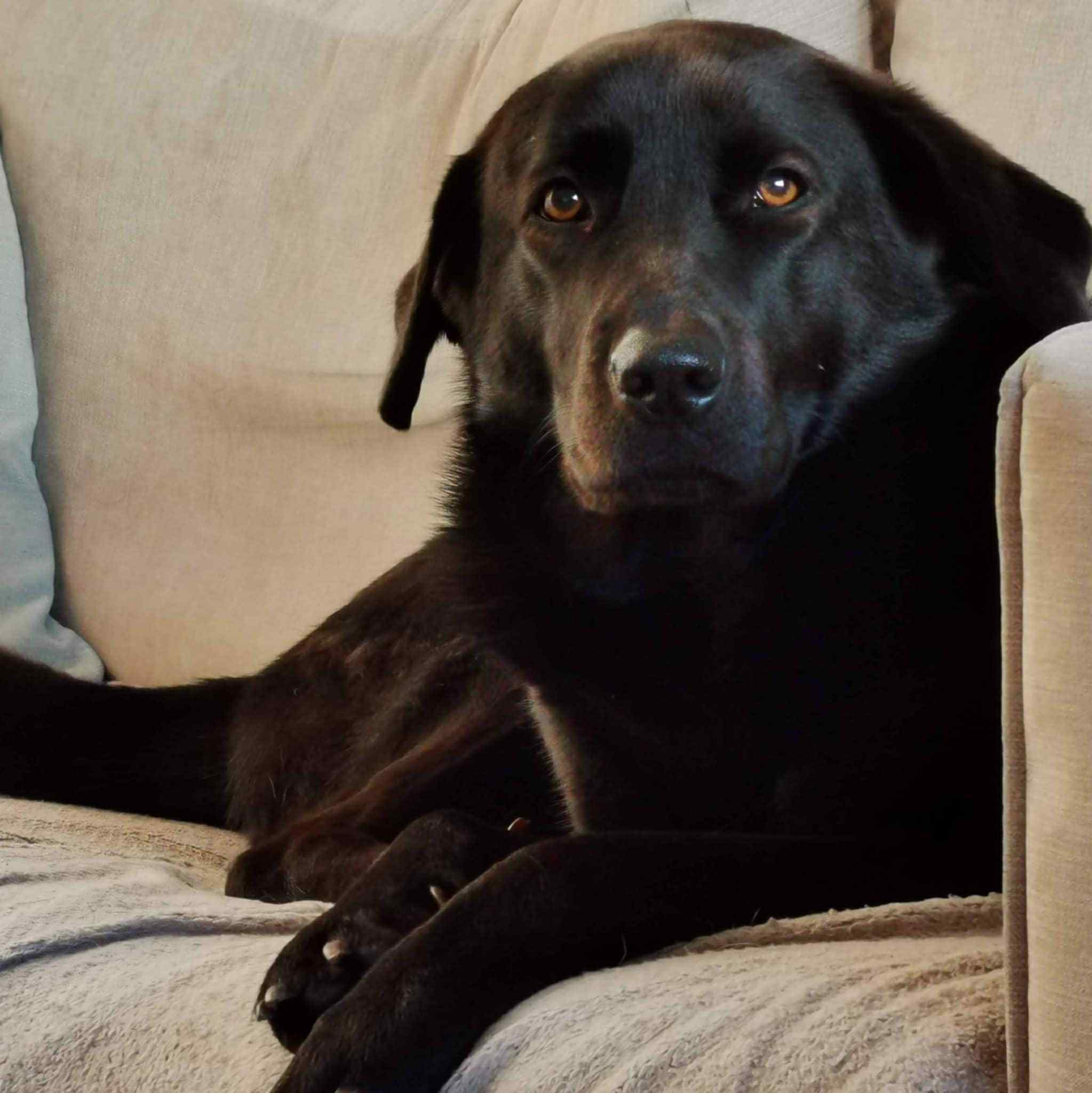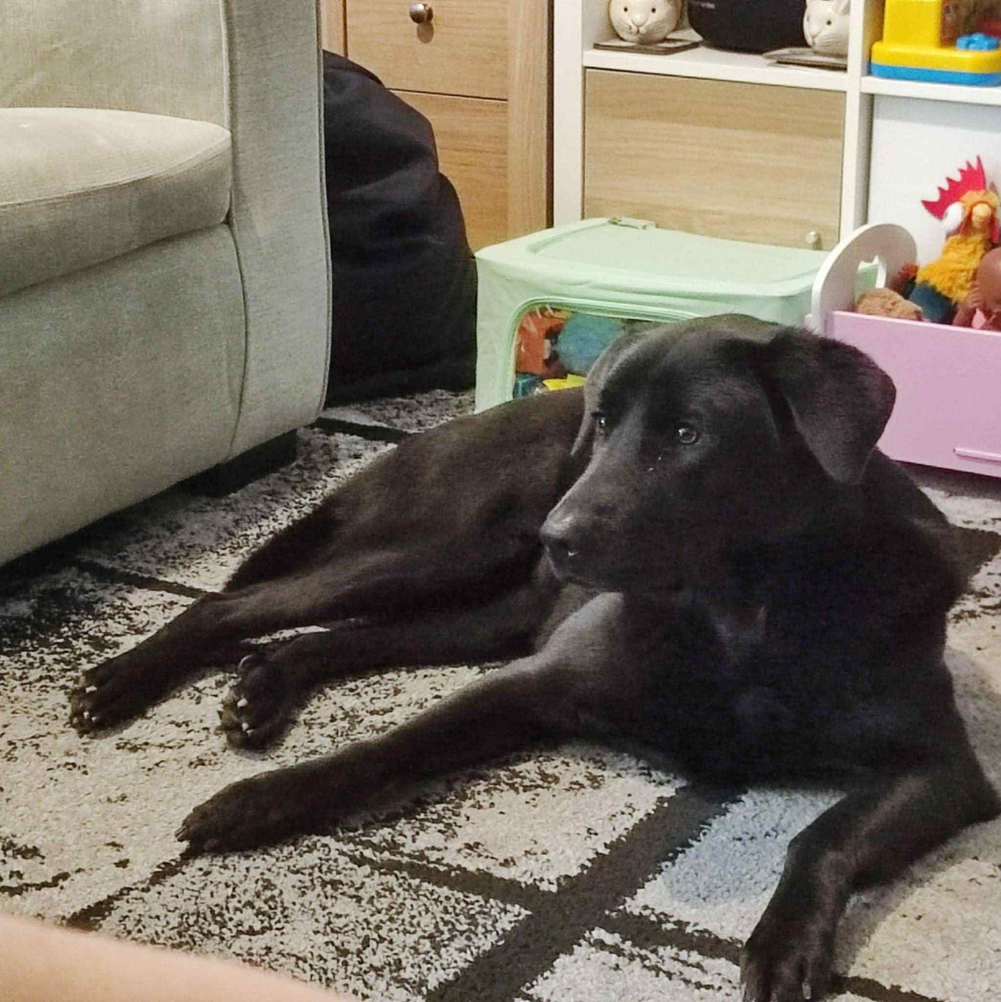 Cassie is a beautiful black Labrador x Alsatian. She is 8/9 years old (but not 100% sure). She is a large dog, she weights 31kg and she is 60cm tall. She is neutered, has microchip and it is up to date with vaccines and diparasite treatment. She doesn’t have any health issues at all. She has a bit of a delicate tummy but is fine on her present raw diet. She eats Nature’s Menu, she loves tripe, beef and turkey, but she won’t touch it if it has chicken in it. She also loves her treats.