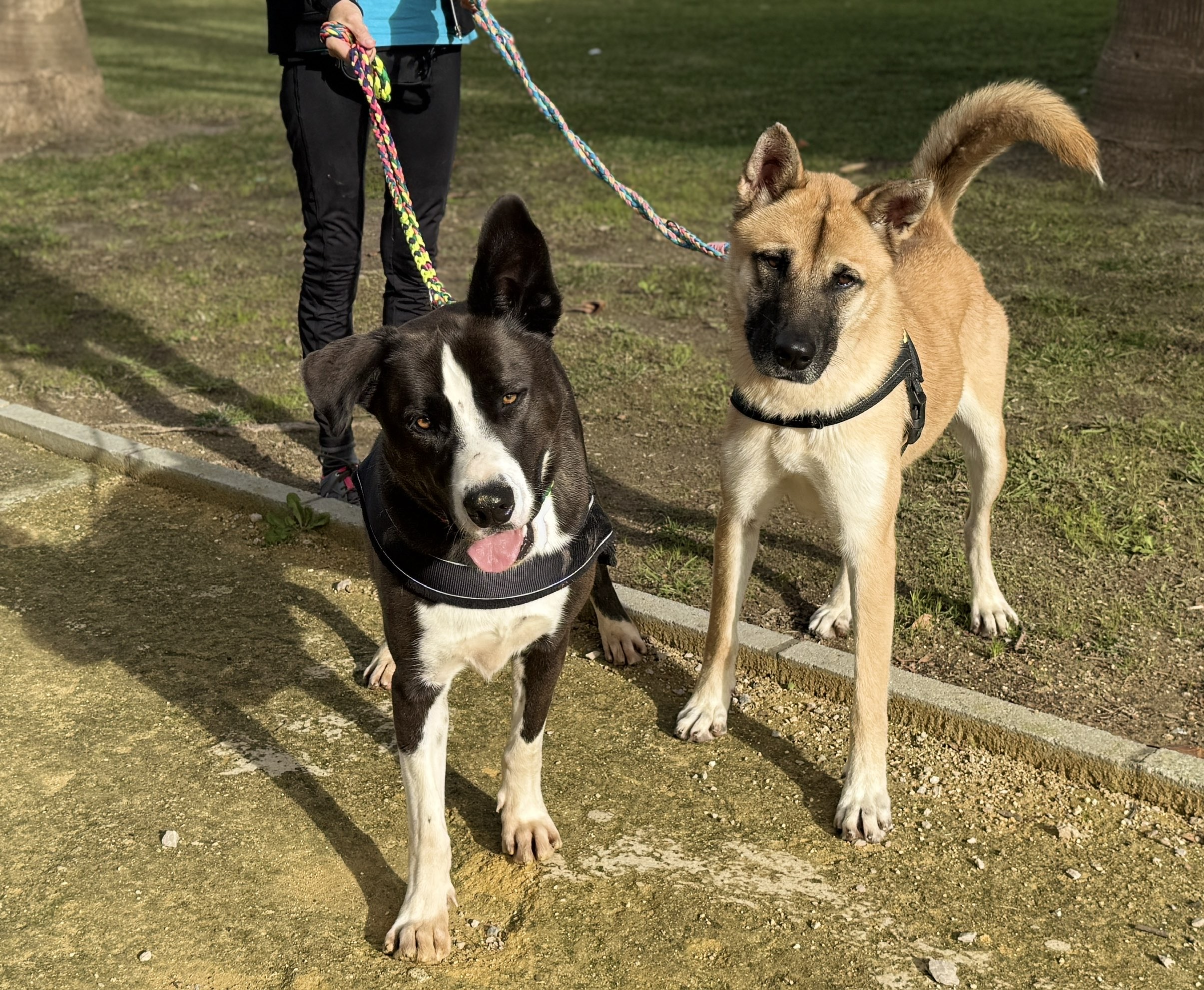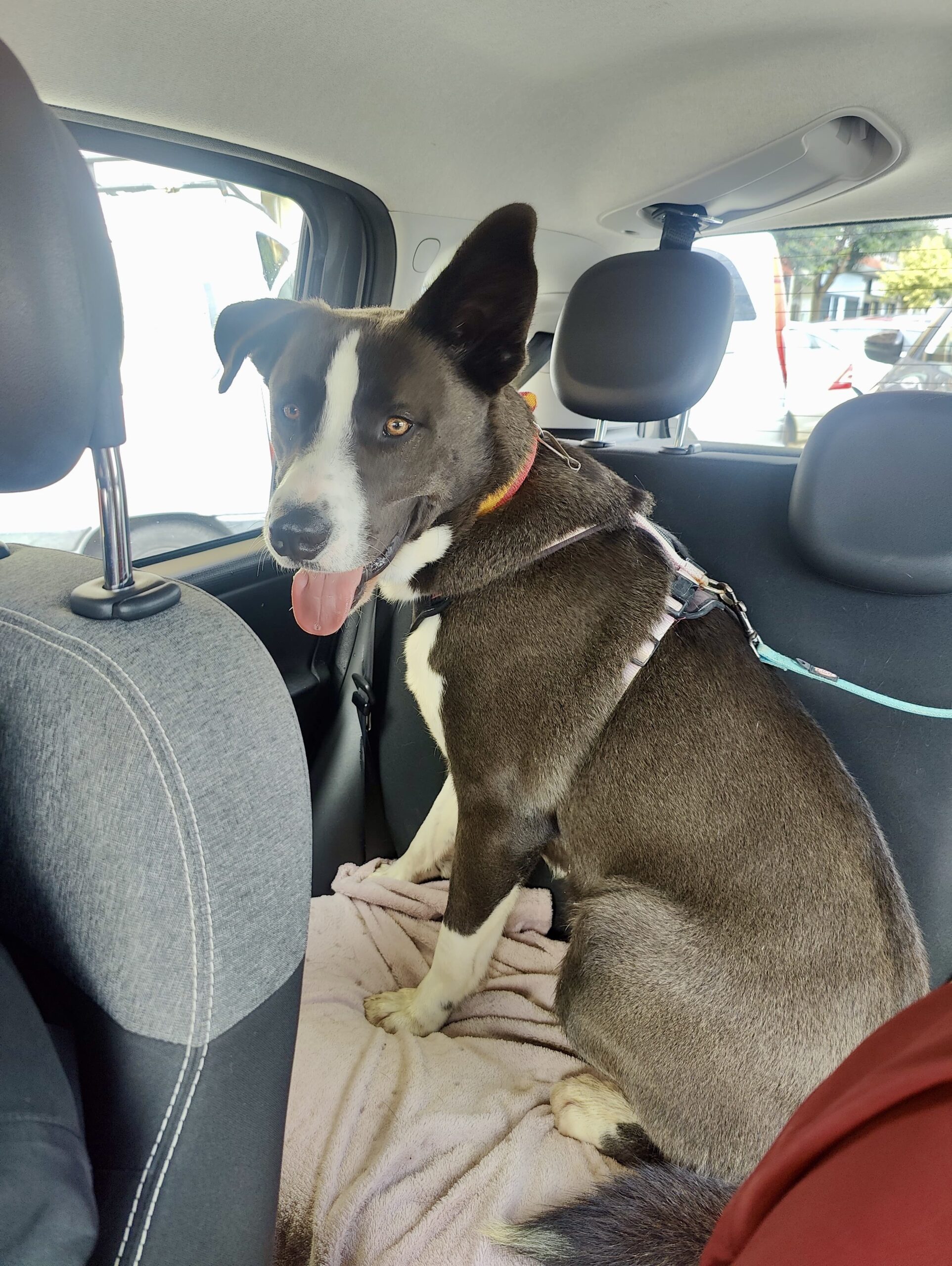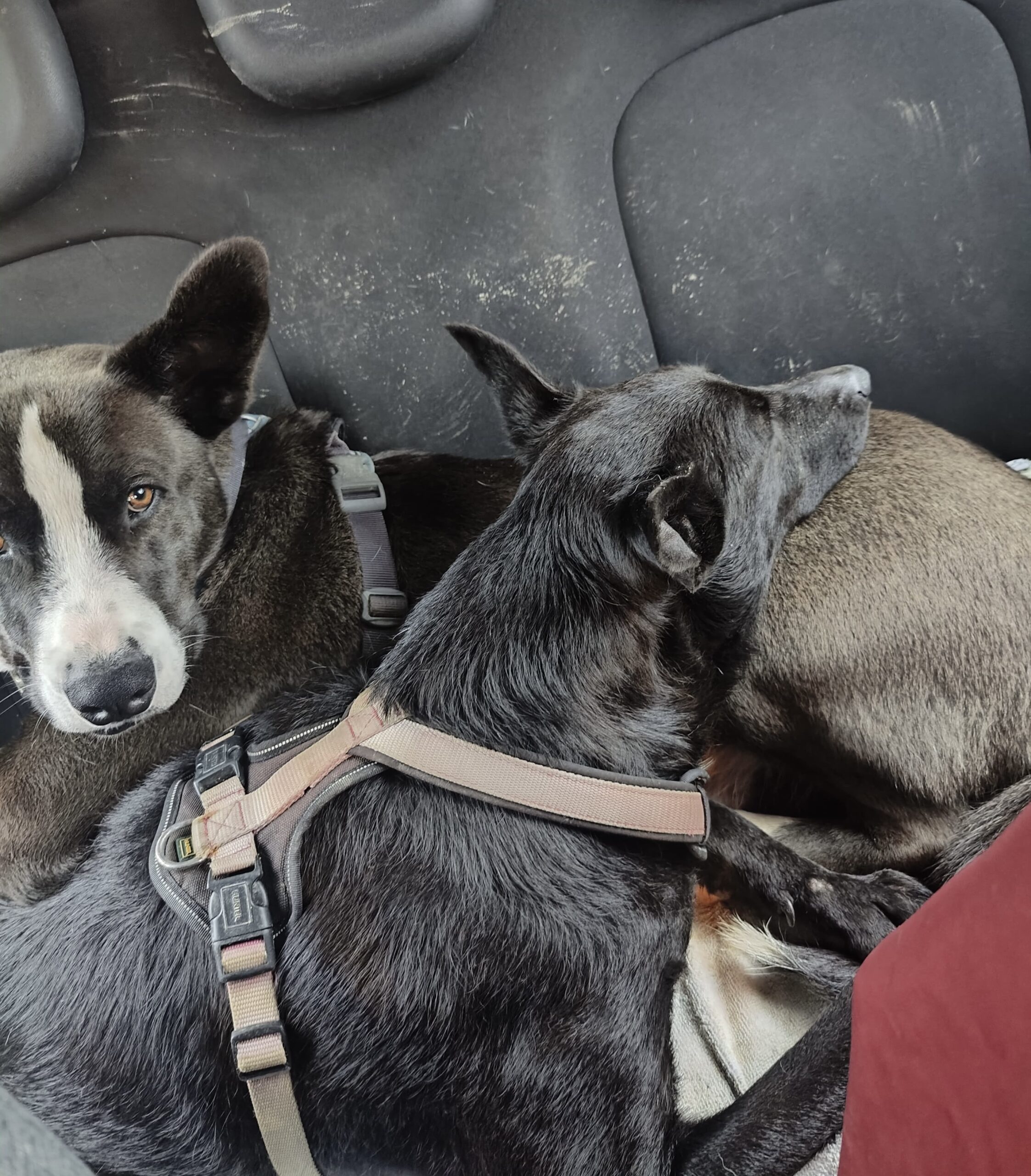 He was understandably a bit overwhelmed by all the new impressions, but he coped well and clearly found reassurance walking alongside his friend Kima. He travelled calmly in the car, and although he pulled a bit on the lead in the village, this was completely expected for a dog with so little experience in such surroundings. He handled traffic and people passing by in a positive way. With other dogs, his reactions varied: some made him unsure, and he would hide behind one of the volunteers, while others simply seemed to make him want to play. Overall, it was more stimulation than he is used to.